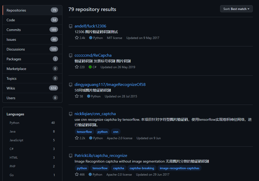 说到图片验证码识别功能,这个功能初步想想也简单,网上搜一下关键词,相关文章和开源项目非常多。以下是github搜索结果: